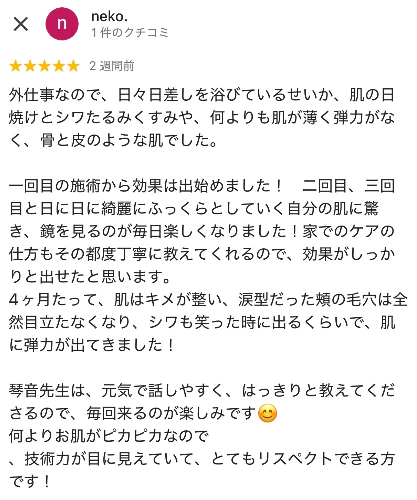 A.さすがプロだな!という印象です。毎回肌の変化や改善していってる箇所を認めてくれて、そして的確なアドバイスをくれること。なので前向きな気持ちにさせてくれます!また、施術時間はリラックスタイムでもあり、癒しの時間でもありました!